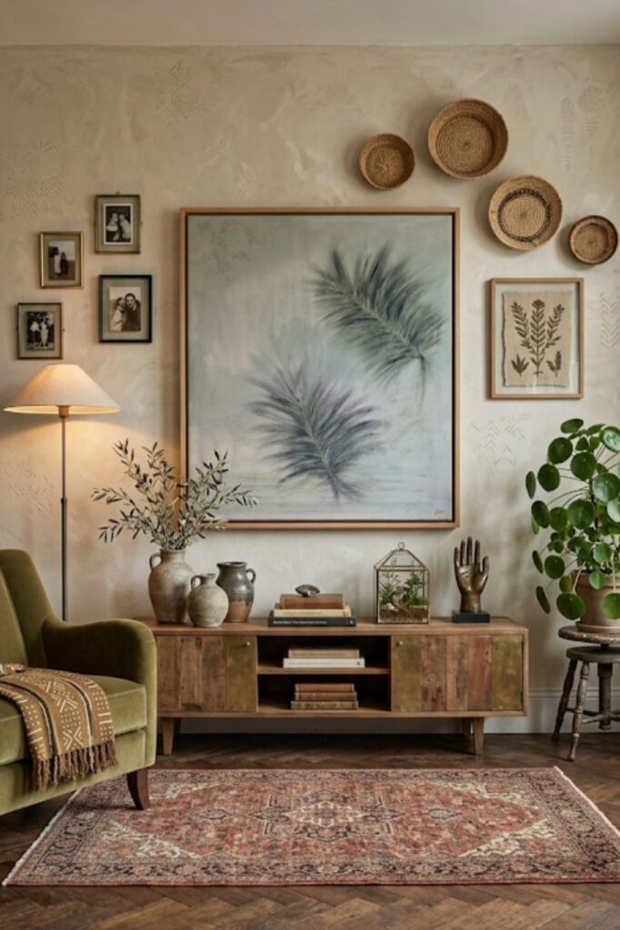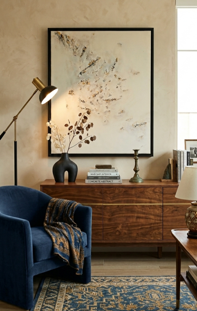 Por otro lado, debemos tener en cuenta el espacio. Si la obra es de gran tamaño tendremos que dejar que respire y no saturarla con demasiados adornos. Si tiene un mueble debajo, este debe acompañar al cuadro pero no competir con él.