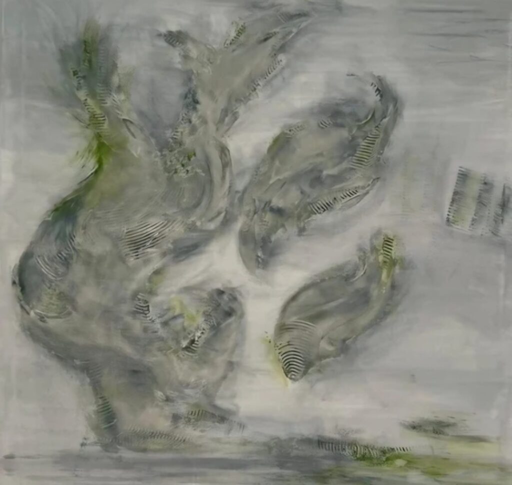 Las texturas en relieve y los arañazos enfatizan la fuerza de esas corrientes.